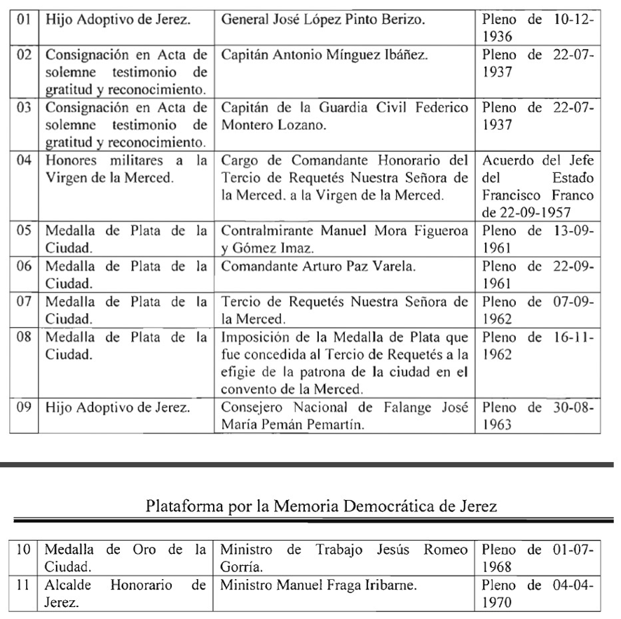 Aunque aún no lo ha cumplido, el Ayuntamiento pleno de Jerez decidió en julio de 2015 derogar los honores y distinciones, aún vigentes, a gerifaltes del régimen: