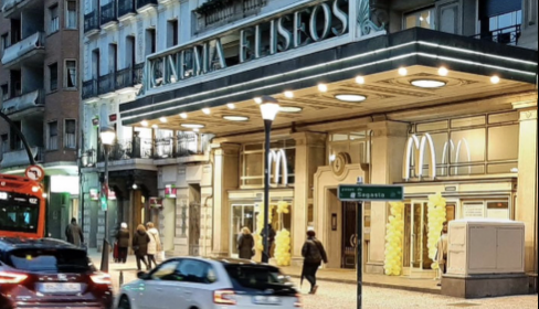 Para los que llegamos a la capital maña después del 2014, el Elíseos nunca estuvo en funcionamiento. Al pasar por la puerta y ver el letrero me imaginé una y otra vez cómo sería por dentro, construí en mi mente a mi bruja favorita en su pantalla de los años cuarenta. Y la semana pasada por fin pude traspasar su umbral, cuando volvió a llenarse de público. La representación era bien distinta pero aún pude reconstruir en mi mente cómo habría alumbrado el patio de butacas la enorme lámpara ovalada que al fin tuve sobre mi cabeza. Conserva su taquilla, aún con la A final medio descolgada. Reabrió el pasado sábado. Desde ese día, la cadena de comida rápida McDonald’s tiene un nuevo restaurante en el centro de Zaragoza.