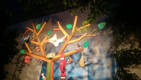 El miércoles pasado asistimos a un montaje precioso en ese lugar mágico que es el Jardín de Berta en la calle Barja. La compañía Teloncillo Teatro nos regaló su espectáculo Nidos (premio al mejor espectáculo para la primera Infancia, FETEN 2014 y finalista de los Premios Max 2015 de las Artes Escénicas en la categoría Infantil o familiar). Esta compañía de Valladolid, Premio Nacional de Artes Escénicas para la Infancia y la Juventud 2013, dejó embobados a los niños y a los adultos que estábamos allí. Sólo los grandes con su profesionalidad y sensibilidad pueden construir algo tan hermoso desde algo tan sencillo. Un árbol y sus ramas, el bosque y sus sonidos, los pájaros y sus nidos.