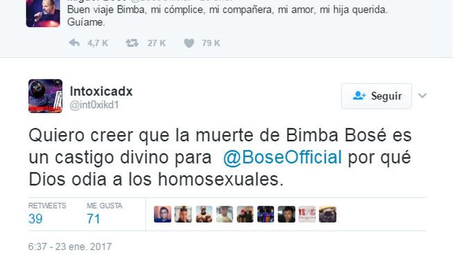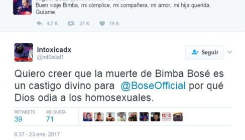 “Quiero creer que la muerte de Bimba Bosé es un castigo divino para @BoseOfficial por que Dios odia a los homosexuales”, es uno de los muchos tuits que recibió la familia de la conocida modelo.