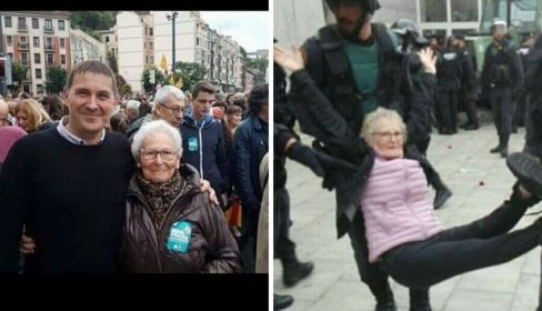 Me llegó a través de Twitter mucho antes que por el Caralibro; no en vano el pajarito es el medio más rápido para la difusión de e-noticias, e-eventos y e-todo en general. Resoplé satisfecho, porque la tesis que defendía la imagen se ajustaba a mis creencias, pero ya uno es perro viejo y no tardó en surgirme un interrogante sobre su credibilidad. Le envié el montaje a mi hermano, con un mensaje adjunto: "Habrá que llamar a un fisonomista". Las ancianitas se parecían. La que posaba sonriente abrazada al terrorista Otegui y la que era llevada por los agentes en volandas, como sacrificada sobre una cruz. Su pelito rizado cano, sus gafitas bondadosas. Su incoherencia como pacífico símbolo de resistencia independentista, de ser cierto aquello. De tan bueno, no podía ser real. Y no lo era, como quedó demostrado unas horas después.