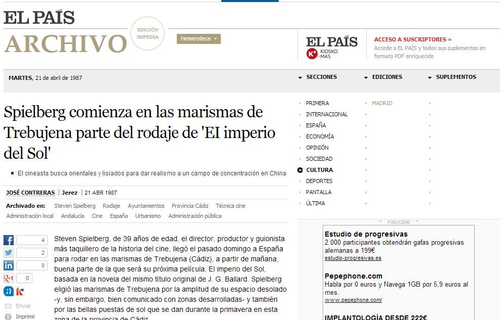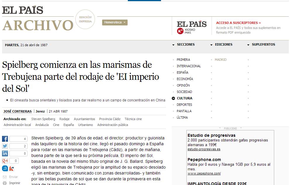 En 1987 yo era el corresponsal de El País en Jerez, una feliz etapa en la que me tocó contar la llegada a la ciudad de Steven Spielberg, entonces con 39 años de edad - el director, productor y guionista más taquillero de la historia del cine- para rodar en las marismas de Trebujena El Imperio del Sol, basada en la novela del mismo título original de J. G. Ballard. La película, cuyo presupuesto inicial fue de 30 millones de dólares, cuenta la historia de Jim, un niño de 12 años preso en un campo de concentración por el Ejército japonés durante la II Guerra Mundial, acontecimiento ya utilizado por Spielberg en otra película, 1941.