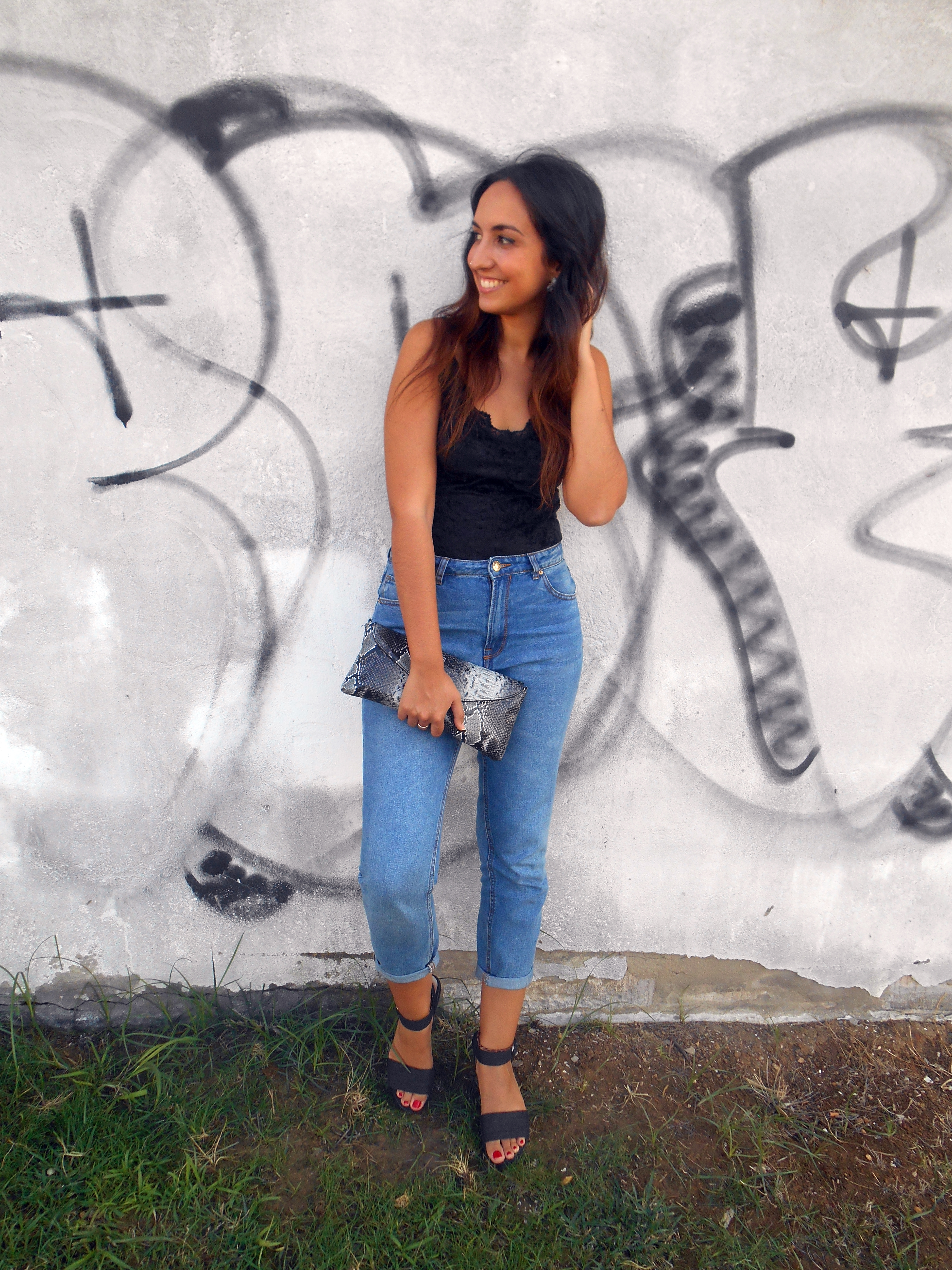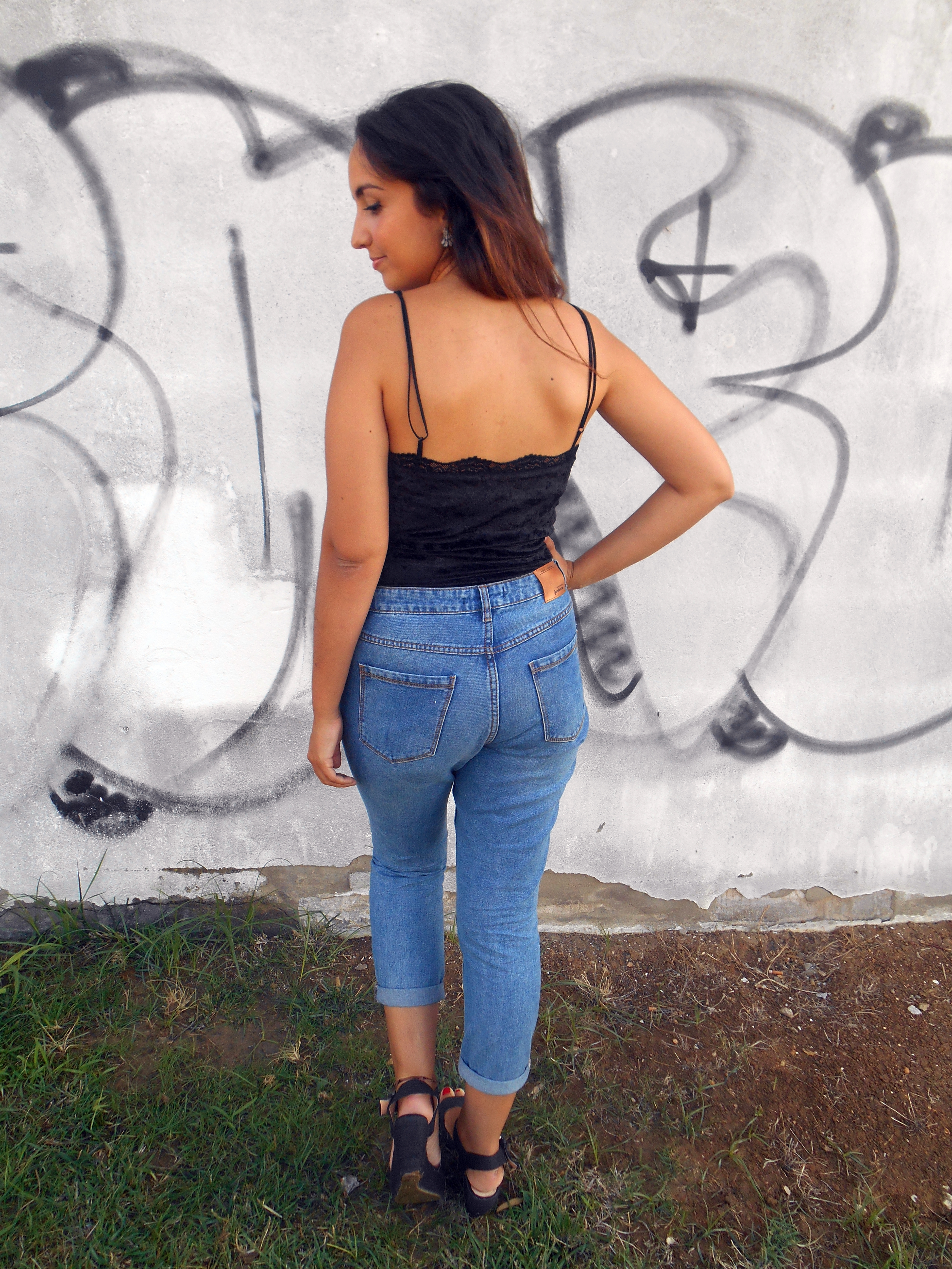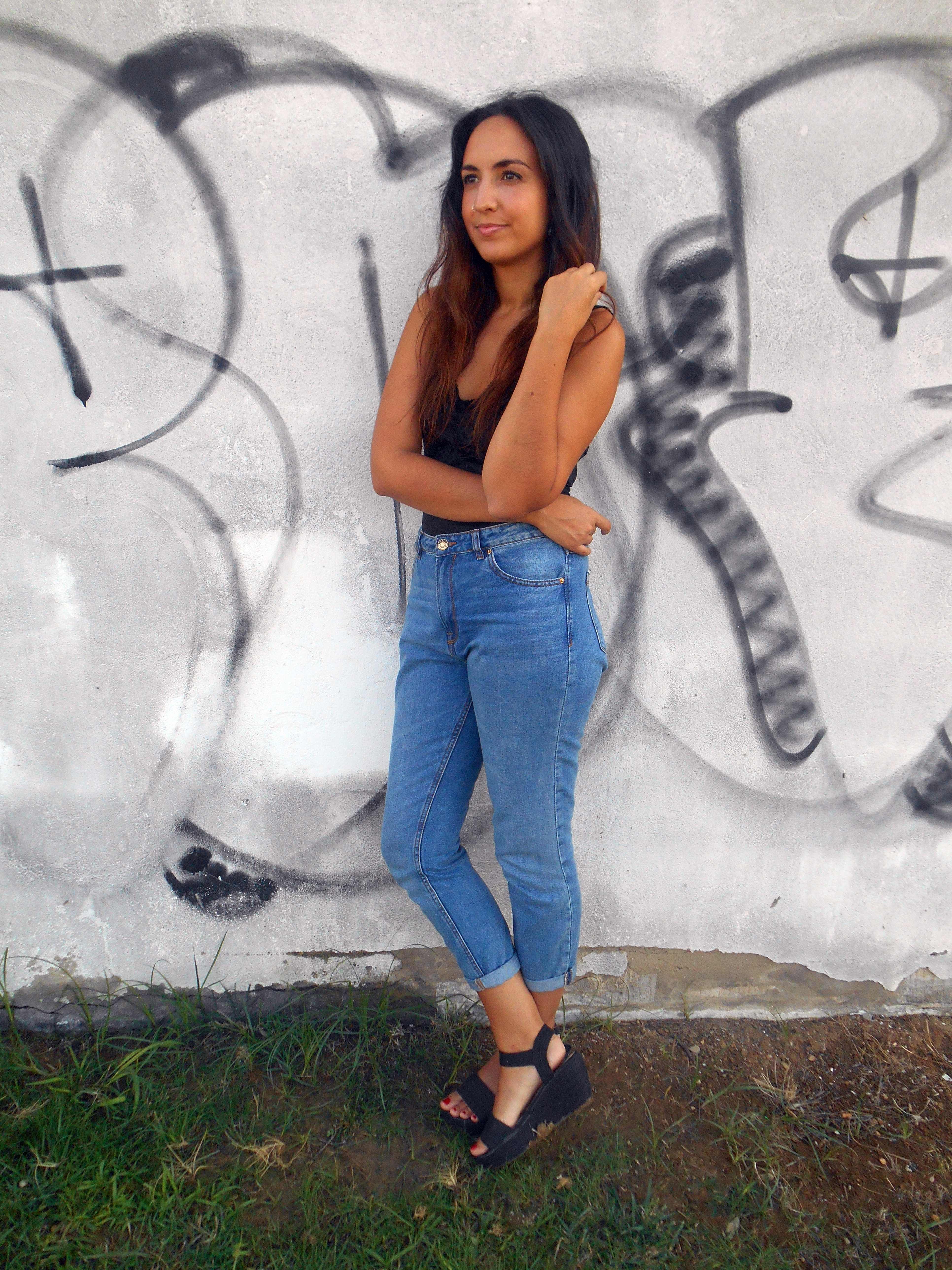 Ésta vez lo combiné con una de mis últimas inversiones en cuanto a pantalones vaqueros, se trata de unos mom fit ¡que me chiflan! Son de talle alto, y no quedan tan ajustados como unos pitillos así que son comodísimos.