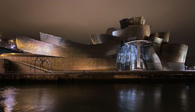 El cielo cubierto de una masa maciza de nubes convierte al cielo en un filtro de luz inesperado y al Museo Guggenheim en un barco fantasmagórico alumbrado por un fuego de San Telmo que no anuncia ningún naufragio y lo hace más grandioso. Más adelante, la representación diplomática de la nueva CiudadPuerto de Hamburgo: dos edificios largos hacia arriba y, entre ellos, una inmensa escalinata solo llena de peldaños. Pensé si podría tener la función de una gigantesca grada para ver las regatas de traineras en la Ría del Nervión, pero justo el puente de Calatrava impediría verlas; Arata Isozaki con Iñaki Aurrekoetxea. El momento Boston de Bilbao. La ría podría servirle a Javier Limón para otro vídeo nocturno con Nella.