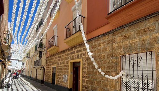 Una muchachada alegre va y viene por las callejas de La Viña, entre panamás y otros mimbres de sombreros, escalera de aluminio en mano, colgando guirnaldas como si le pusieran un techo al barrio. Un sombrajo de pompones blancos que con pensamiento mágico serían los ángeles blancos que hubieran acompañado a la Virgen en su tránsito, más conocido como la asunción, “no confundir con ascensión”, que esta es la del señor. Una guirnalda que en la calle Pastora dejó de ser tejado angelical fue anudada a la reja de una ventana, con lo que se convirtió en la Escalera de Jacob, escalera que unía el cielo y la tierra desde la tradición judía. Pensamiento mágico de Cadi.