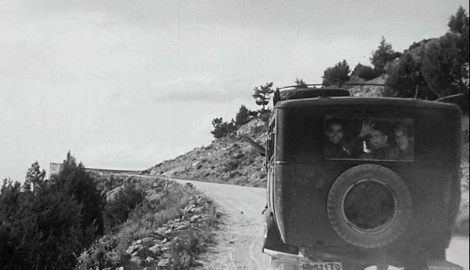 Tiene el vehículo algo de transporte bélico, con su fisonomía castrense, la polvareda que levanta, la rueda de repuesto y ese color que no advertimos por el blanco y negro de la foto con casi un siglo pero que nos parece del mismo color negro de los ataúdes. Se distinguen otros dos rostros que miran igualmente a la cámara que viene detrás, probablemente en otro coche, o en una moto de aquellas con sidecar, quién sabe. Parece que hay más gente en el interior del coche, al margen del conductor que saluda con la mano, pero solo se ve con cierta nitidez a Federico y a esos dos compañeros. Y solamente él llena de luz el momento congelado. Lo hace con su tremenda sonrisa, que no solo se le advierte en la boca sino en los ojos, en los pómulos, en la frente, en la barbilla dispuesta para el ancho desparpajo de despertarles la felicidad a los demás.