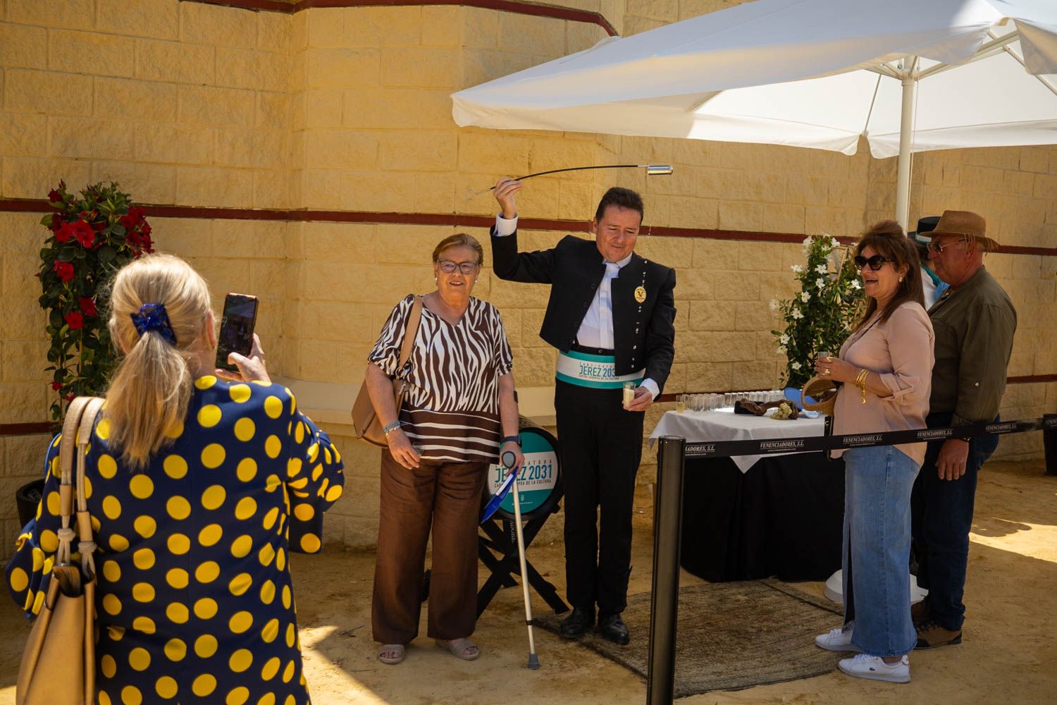 Al llegar, en la portada de la Avenida, me encuentro con Jesús Rubiales, venenciando. Está en la puerta principal de la Feria recibiendo así a los visitantes con un vasito de fino de Jerez, haciéndose fotos con todo aquel que se lo pide y luciendo un fajín con el emblema Jerez Capital Europea de la Cultura 2031.