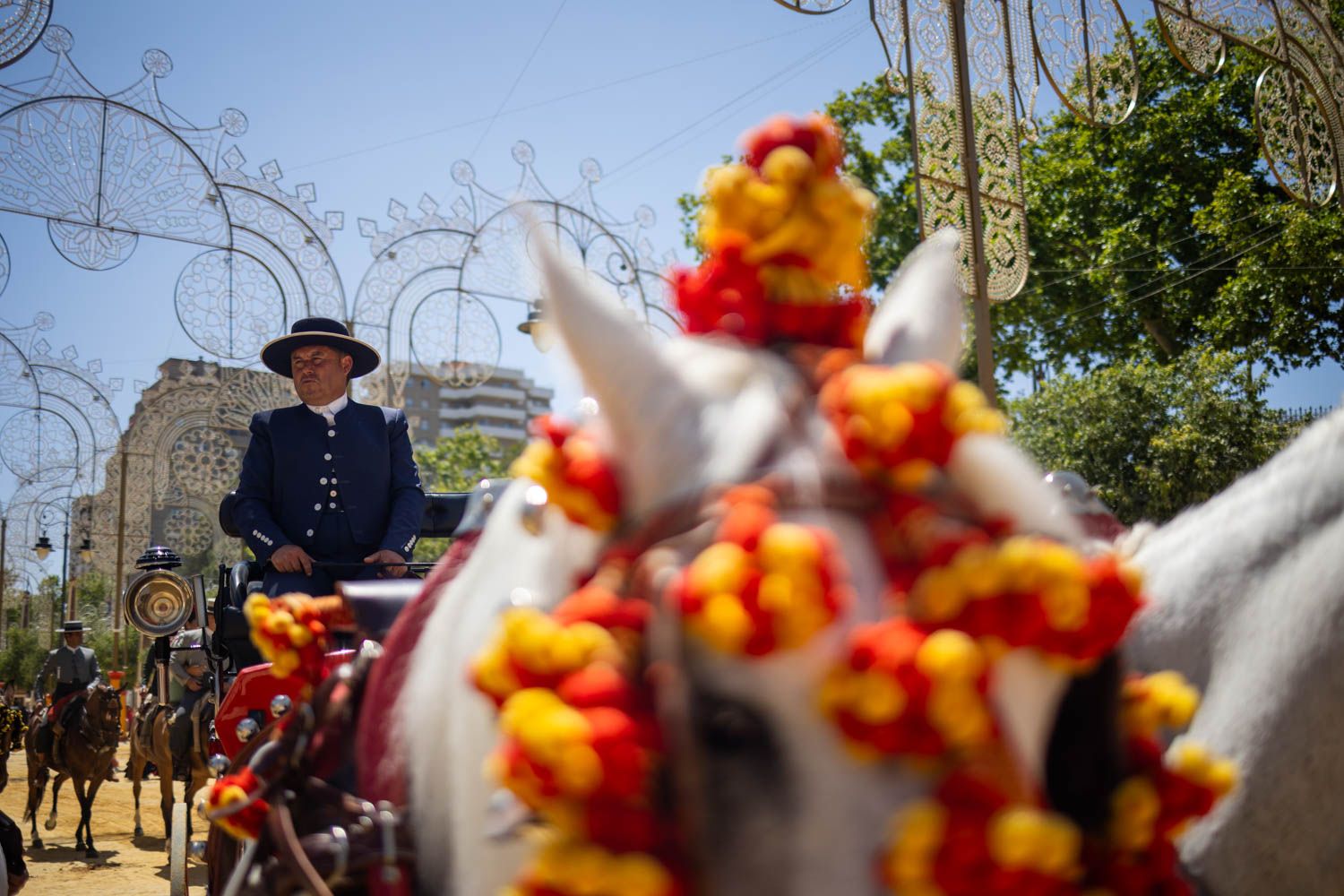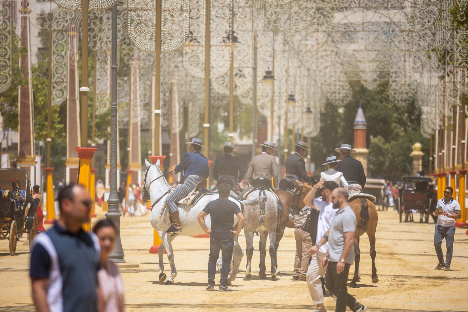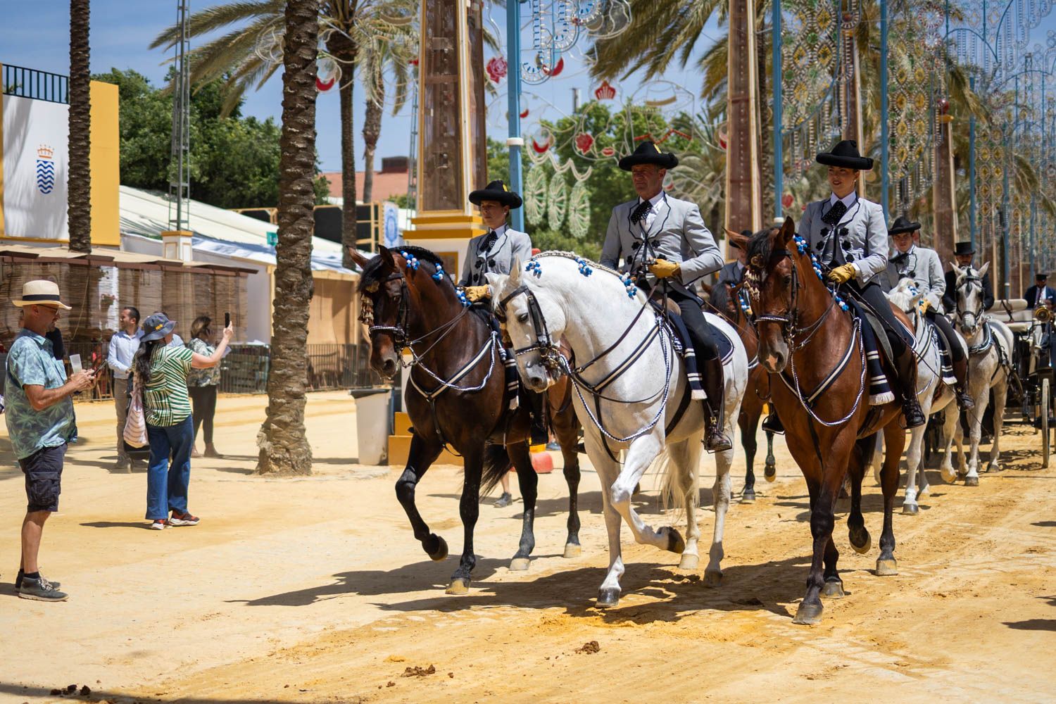 El Paseo de las Palmeras se ha llenado de personas montadas en sus caballos, disfrutando de un primer domingo de Feria con mucho sol y algo de viento.