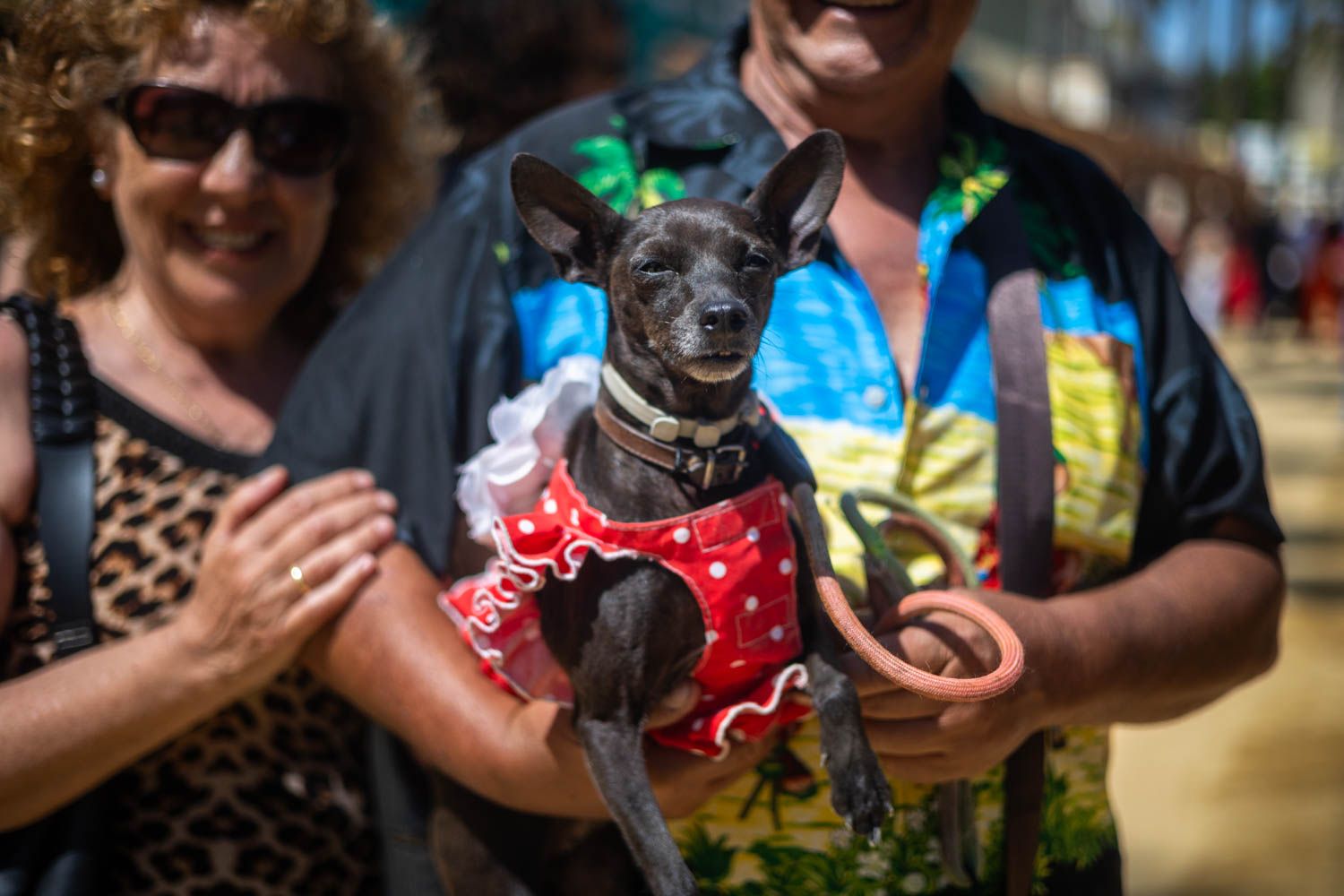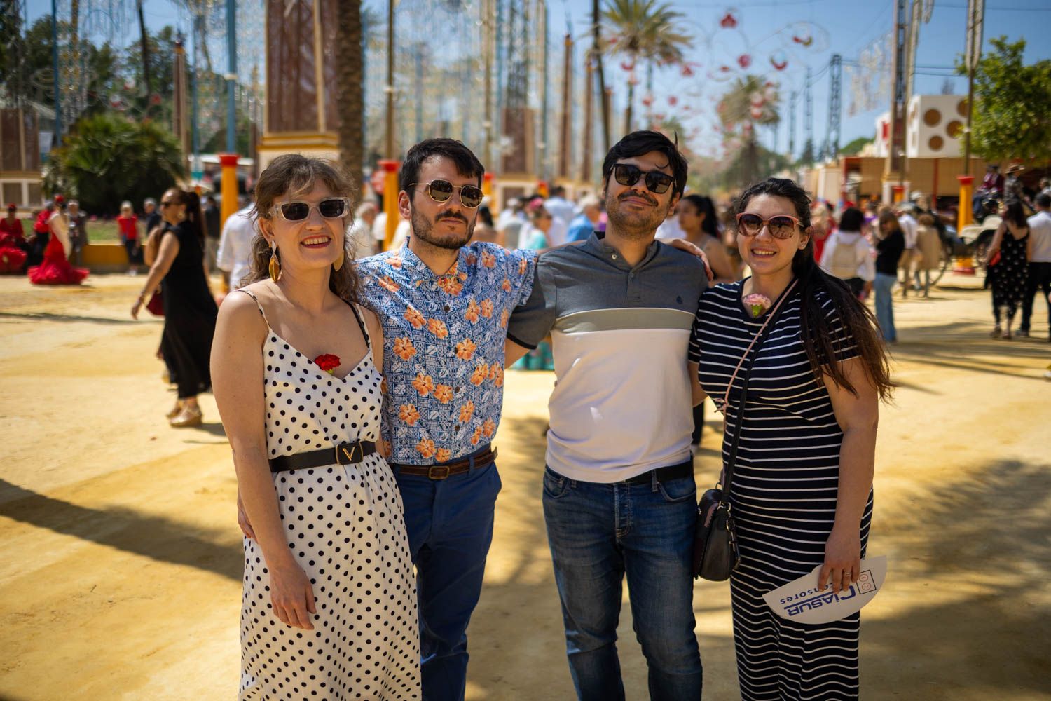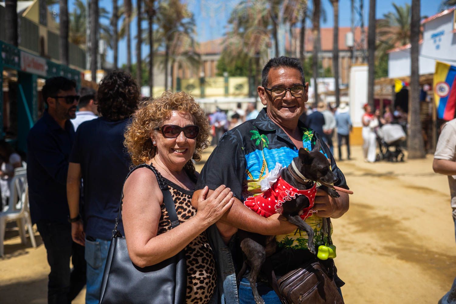 No sé si es por los rebujitos, el dolor de cabeza que llevo, el viento o la alergia, pero a lo lejos me llama la atención una estampa poco habitual: dos personas paseando con su perrita por la Feria. Lo más curioso es que Tina, así se llama la perrita, va vestida de flamenca, acompañada de sus dueños, Maricarmen y Antonio.