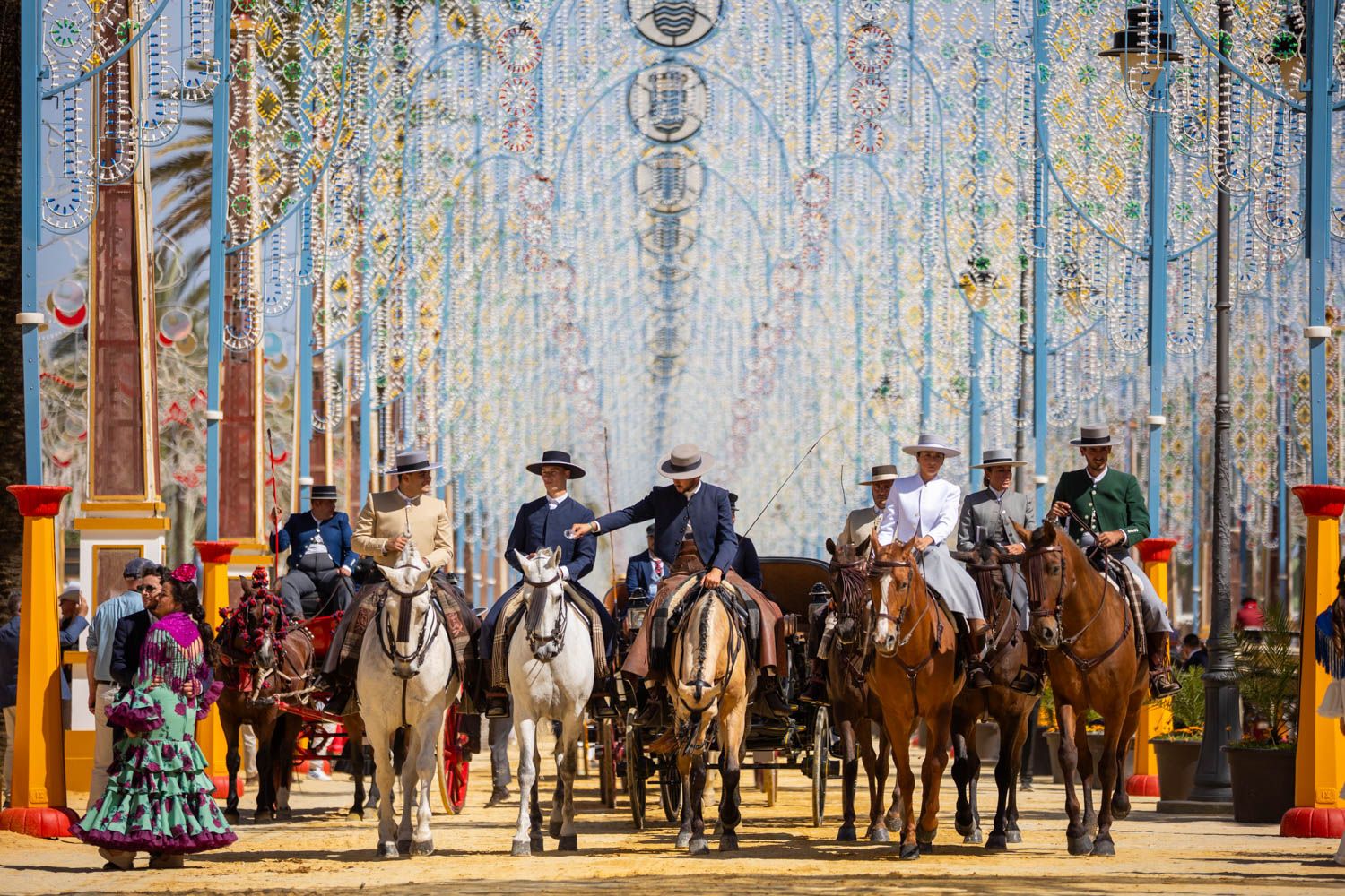 Caballistas de la Real Escuela Andaluza del Arte Ecuestre paseando por la Feria, luciendo unos hermosos ejemplares de pura raza.