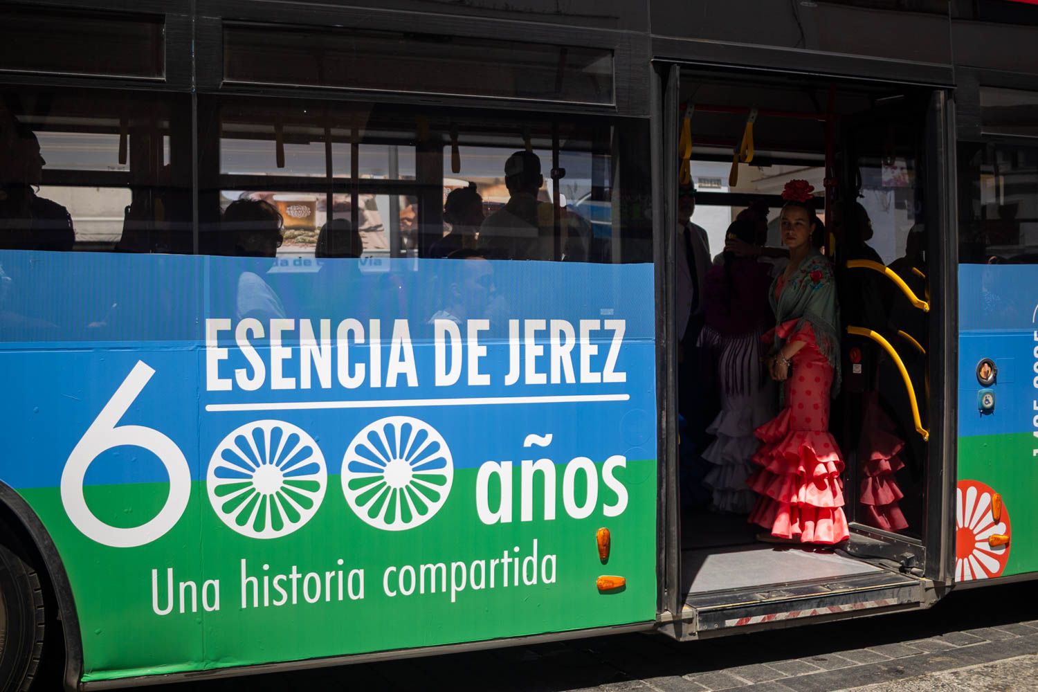 Salimos de casa y nos dirigimos hasta la plaza Esteve, el autobús de las 13.00 horas salía casi puntual, rebosando de gente venida de los múltiples hoteles y apartamentos turísticos de la zona del centro. Comenzaba el primer día de la Feria de Jerez. Los autobuses van 'vestidos' homenajeando a la comunidad gitana, de cuya llegada a la Península se cumplen 600 años.