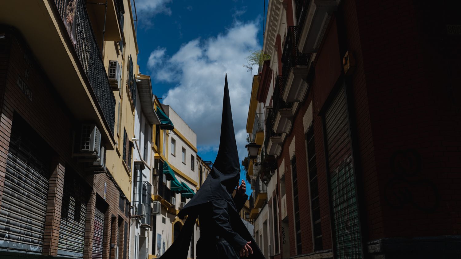 Un nazareno de la hermandad de Los Servitas, en la calle San Luis, camino de la capilla del los Dolores