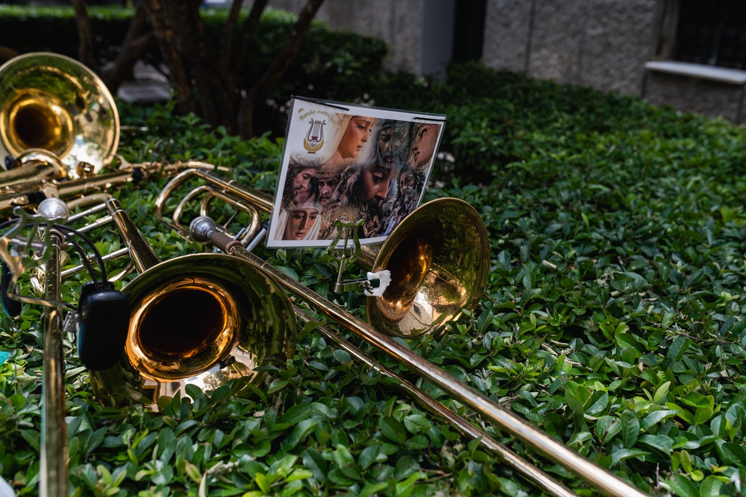 Instrumentos de la Banda Municipal de Coria, apoyados sobre unas plantas