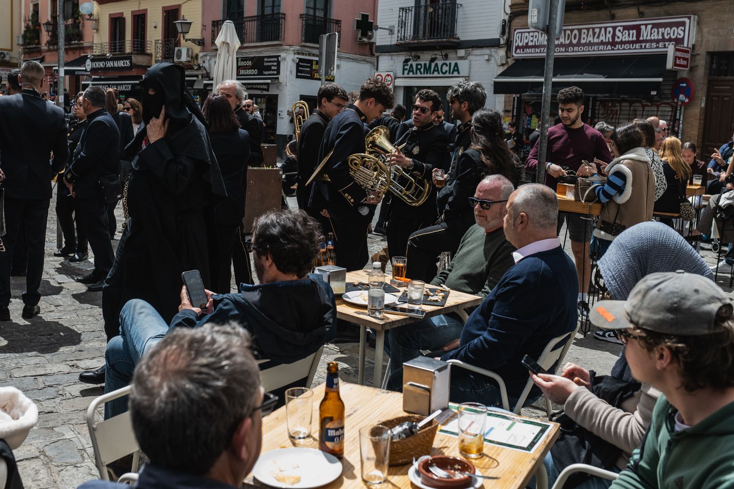 Vecinos de la plaza de San Marcos, presenciando la salida de la hermandad de Los Servitas