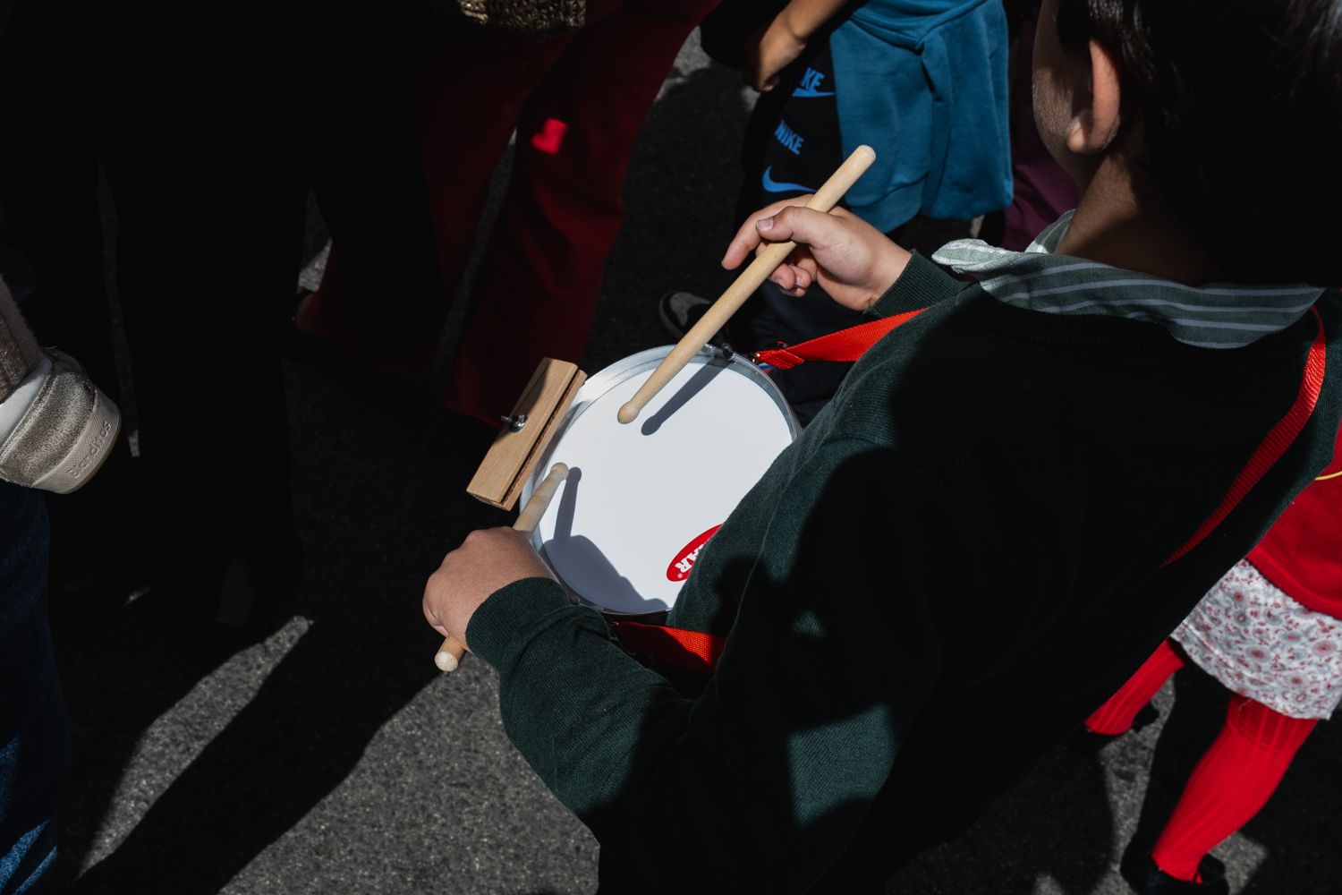 Un niño toca un tambor de juguete en la Puerta Osario