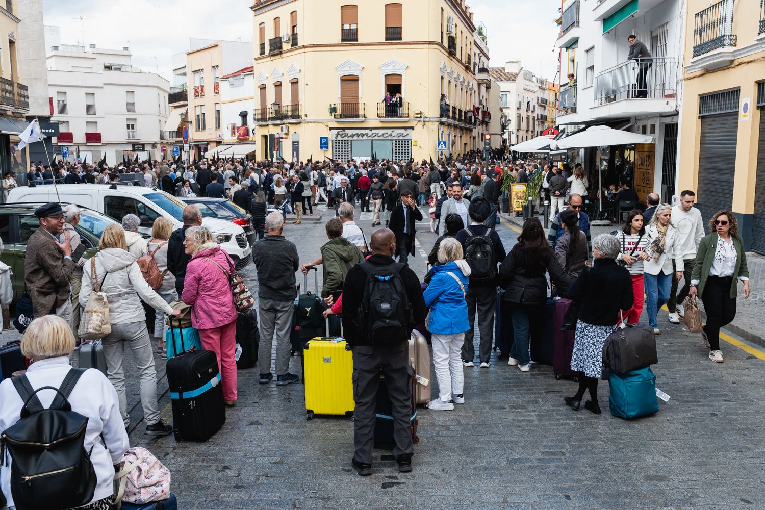 Un grupo de turistas atrapado por el paso del cortejo de La Trinidad