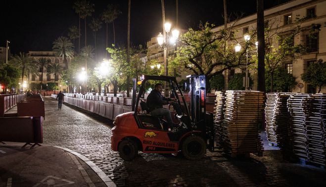 No se había recogido La Piedad y ya estaban casi retiradas, amontonadas y a punto para ser cargadas las sillas de los palcos de la Carrera Oficial de la Semana Santa de Jerez. El gobierno local ha planificado, junto con la Unión de Hermandades, un desmontaje exprés de las infraestructuras que han conformado el itinerario común de las hermandades y cofradías de esta Semana Mayor jerezana, plena en cuanto a salidas procesionales y con momentos complicados en lo organizativo.