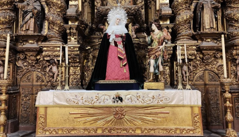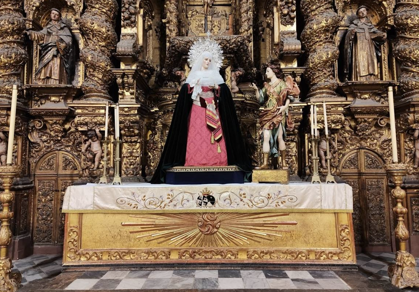 Una parte de la cornisa interior de la capilla de la Hermandad de la Oración en el Huerto en la iglesia de Santo Domingo de Jerez se ha desprendido lo que obligado a acotar la zona afectada y trasladar la imagen de la Virgen de la Confortación y del Ángel al retablo mayor del templo, mientras que el Señor ocupa ahora el centro de la capilla.