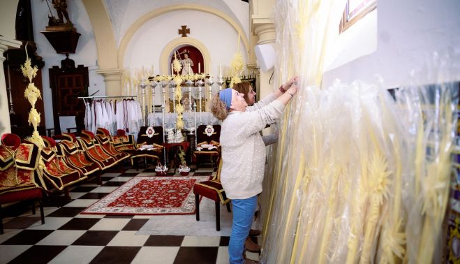 Rafi Palmero e Isabel Venegas llevan días que trabajan en los preparativos desde que amanece hasta que cae el sol. "Hoy hemos comido un bocadillo, estamos cansadas ya a estas alturas, pero esto merece mucho la pena, va a quedar todo precioso", comentan en un templo que es un hervidero de quehaceres en los días previos al arranque de la Semana Santa.