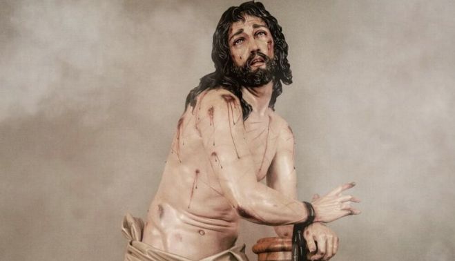 La talla, que reproduce con sobrecogedor pasaje evangélico de la flagelación, está elaborada en madera policromada a tamaño natural, con una altura de 1,80 metros, y su vendedor informa que "el escultor ha incorporado a esta imagen los característicos hematomas y laceraciones de la Flagelación, representados con gran detalle y dramatismo".