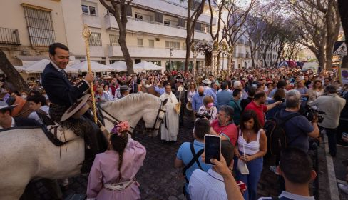 Mayores, jóvenes, pequeños; ellas, que son las que más color ponen al gentío rociero, con los mejores trajes de rociera para salir de Jerez y tocadas con esas flores contrahechas mezcladas con ramitas de romero decorando moños. En Cristina se confunden los sentimientos, la alegría de los que se van y el pesar de los que se quedan pero que llevan muy en sus adentros su devoción rociera.