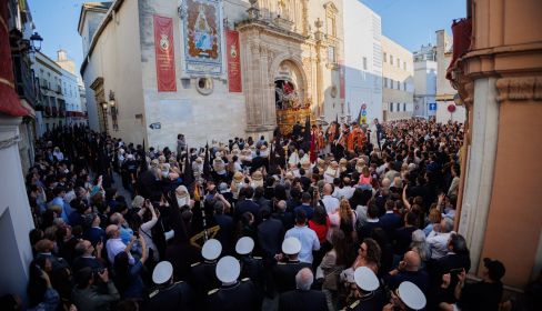Al mismo tiempo que el Cristo de la Lanzada encara Plateros, el Jueves Santo se completa y se comprime aún más con la salida desde San Dionisio del original misterio del Ecce-Homo y del palio de la Virgen del Mayor Dolor, otra de las grandes dolorosas de la Semana Santa jerezana.