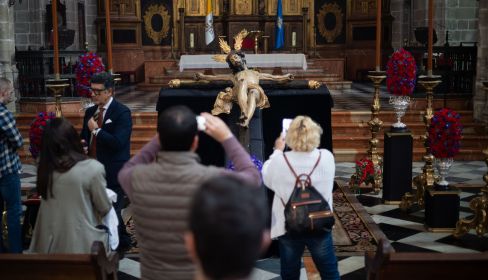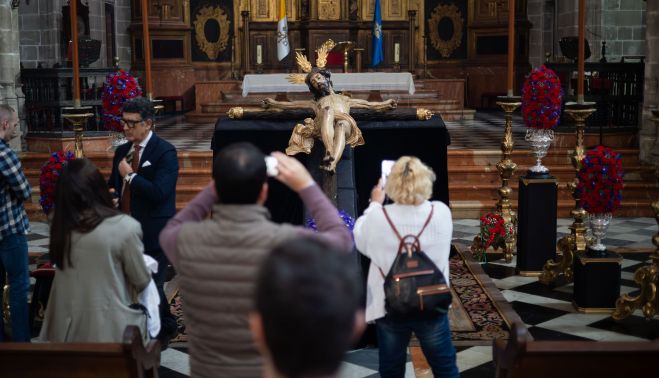El Crucificado de San Miguel fue expuesto en horizontal inclinado dejando la cabeza más elevada. En vez de la capilla del sagrario, con sucedió hasta hace pocos años, fue situado al pie del presbiterio en su cruz arbórea y con un centro de alelíes morados a sus pies. En San Francisco el Señor estuvo expuesto en la capilla del Voto sin más artificios que la sola imagen en el centro escoltada por hachones y decoración floral. Como siempre.
