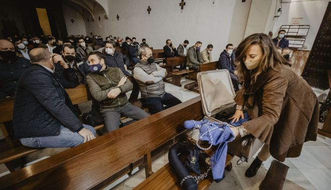 Molías, costales, fajas, camisetas, pantalones, zapatos, cinturones….. todo tematizado con el escudo o colores de la hermandad. Todo lo lleva en una maleta que abre ante los reunidos y comienza una intervención muy medida para no hacer perder el tiempo al capataz: yendo al grano. Silvia Toro comenta a este medio que los dos años sin procesiones han sido terribles: "He estado a punto de tirar la toalla. Pero seguimos porque soy muy entusiasta e incansable". No solo se refiere a lo relacionado con costaleros y nazarenos, también se resiente el negocio por la suspensión de ferias y eventos de todo tipo. "Antes había que ir a Sevilla a comprarlo casi todo. Ya no, en Jerez ofrecemos todo lo que se necesita", concluye.
