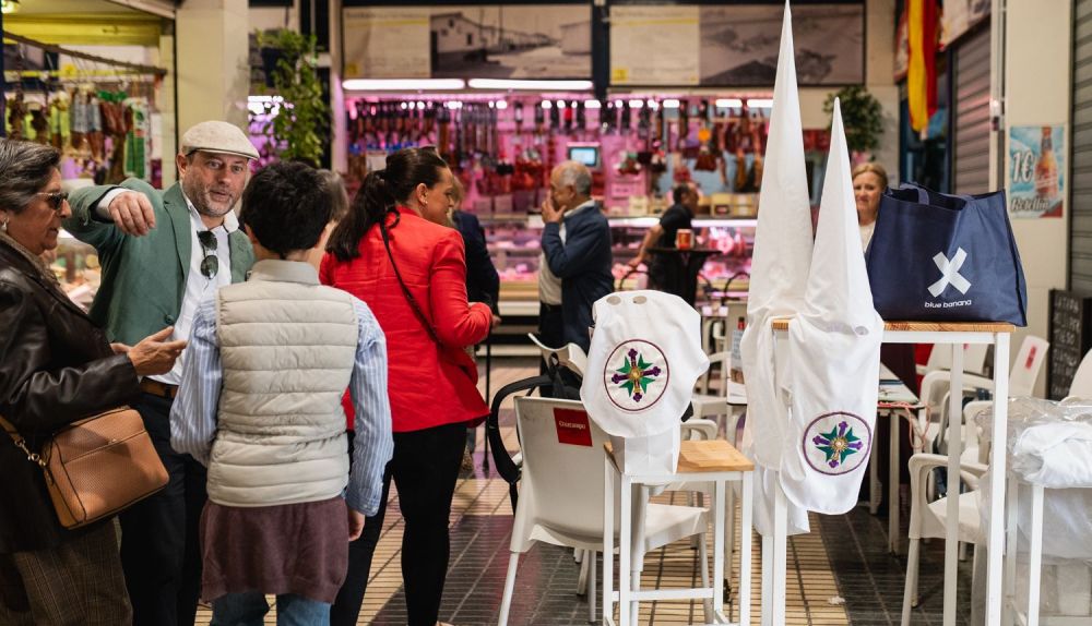 Aun así, es un día con menos movimiento del habitual. Algunos vecinos se acercan, pero la falta de pescado habitual de los lunes y la salida de la cofradía hacen que otros puestos decidan no abrir. Francisco tiene uno de los pocos bares que hay en este mercado. Él sí se quedará hasta que las túnicas blancas abandonen el lugar. "Hoy se venden refrescos, bocadillos y agua por un tuvo", dice en un día que es "tranquilito".