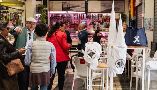 Aun así, es un día con menos movimiento del habitual. Algunos vecinos se acercan, pero la falta de pescado habitual de los lunes y la salida de la cofradía hacen que otros puestos decidan no abrir. Francisco tiene uno de los pocos bares que hay en este mercado. Él sí se quedará hasta que las túnicas blancas abandonen el lugar. "Hoy se venden refrescos, bocadillos y agua por un tuvo", dice en un día que es "tranquilito".