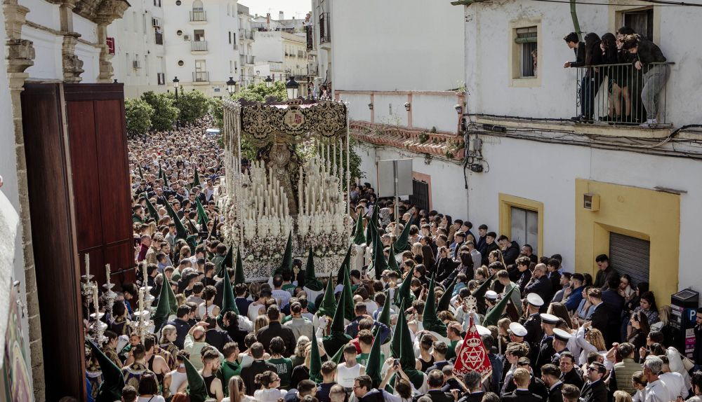 Hermandad de la Candelaria. Desde la Catedral y San Francisco: salida 13 h. Recogida17.30h. Itinerario: Plaza de la Encarnación, Calle de la Rosa, Calle Manuel María González, Plaza Monti, Plaza del Arenal (lado derecho), Corredera, Plaza Estevez - se incopora desde San Francisco La Candelaria- Calle Larga, Calle Porvera, Calle Lealas y Plaza de la Constitución. Música: Lágrimas de San Fernando (se incorpora en el monumento a las cofradías) y Enrique Galán en el palio desde San Francisco.