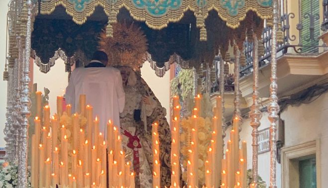 Durante varios minutos, un componente de la hermandad de la calle Medina ha estado revisando la parte de la mano derecha de la Virgen. Finalmente, todo quedó solucionado y el paso de palio, con la voz de Martín al frente, siguió su camino hacia Carrera Oficial.