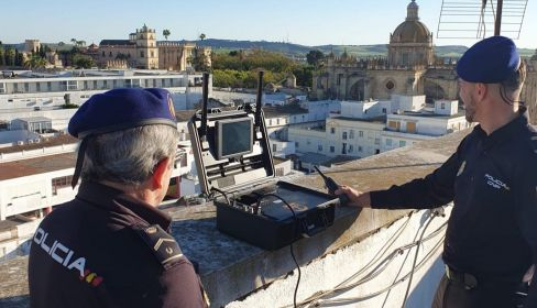 La unidad delegada de Medios Aéreos de Jerez tiene varios puntos desplegados en distintos puntos de la ciudad, desde los que se controlan a vista de pájaro los recorridos procesionales, evitando así cualquier interferencia indeseada.