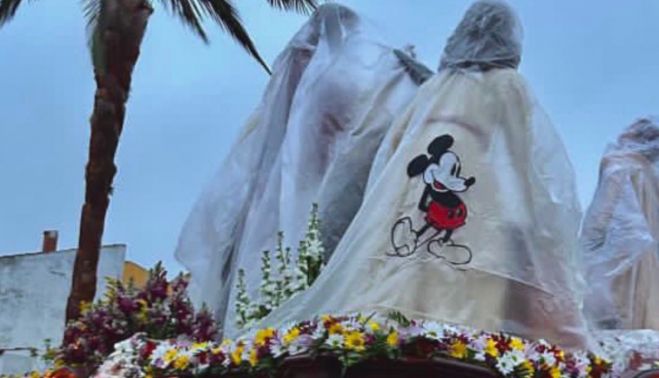 Y cuando ha aparecido la lluvia han echado mano de los primeros chubasqueros que han encontrado a mano. Así, en Peñarroya-Pueblo Nuevo (Córdoba) se ha visto a una de las imágenes de La Borriquita con un chubasquero de Mickey Mouse.