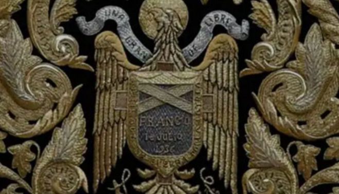 Este estandarte en el que puede leerse 'Franco 1936' y 'Una, grande y libre' salió el sábado en procesión de la Cofradia de 'El Mutilado'.