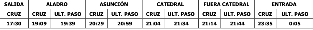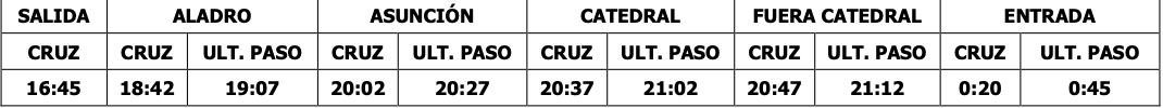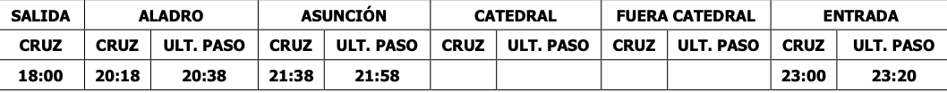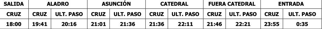 Itinerario: Plaza Nuestro Padre Jesús de la Sagrada Cena, Plaza San Marcos, Plaza Rafael Rivero, Puerta de Sevilla, Porvera, San Juan de Dios, San Juan Grande, Plaza Mamelón (Carruaje), Sevilla, Eguiluz, Plaza Aladro, Palquillo, CARRERA OFICIAL, Reducto Alto, Encarnación, De la Rosa, Manuel María González, Pozuelo, Pz. Vargas, Letrados, Asunción, Chapinería, Sedería, Plateros, Plaza Santo Ángel, Tornería, Plaza Rafael Rivero, Plaza San Marcos, Plaza Nuestro Padre Jesús de la Sagrada Cena.