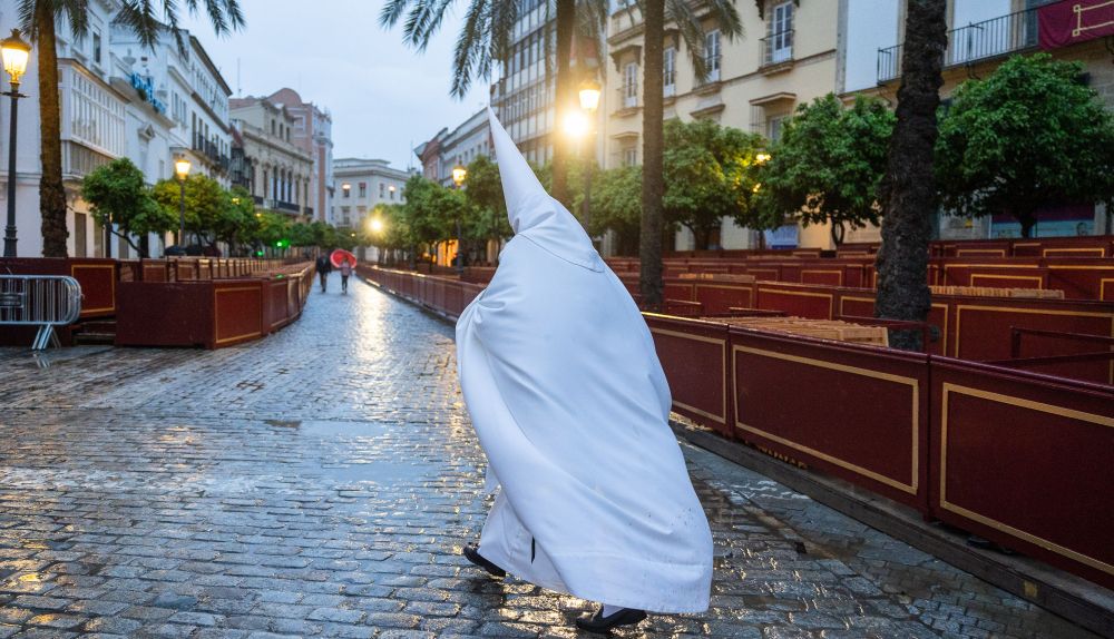 ‘Ahí queó’ el Domingo de Ramos de calles mojadas, de soledad en la Carrera Oficial, de lágrimas en grandes y pequeños, de silencios, sin bullas, sin gente en los bares, hosteleros con dos palmos de narices, de camareros de brazos cruzados, de trajes mojados y peinados deslucidos, de carritos de chuches tapados con plásticos y de caras torcidas de sus propietarios… Un sinfín de estampas que nos enseñan la cara más triste de la Semana Santa.