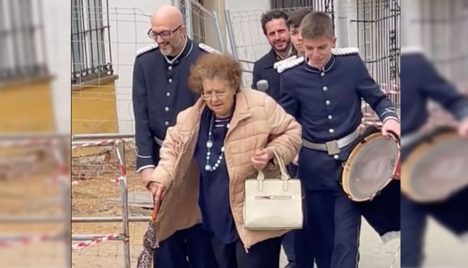 Así, como si se tratase de un paso que va cuesta arriba, la abuela anda acompañada del sonido de los tambores. "Anda, qué bien acompañada vas", le comenta una vecina. La protagonista del vídeo no puede evitar la sonrisa.