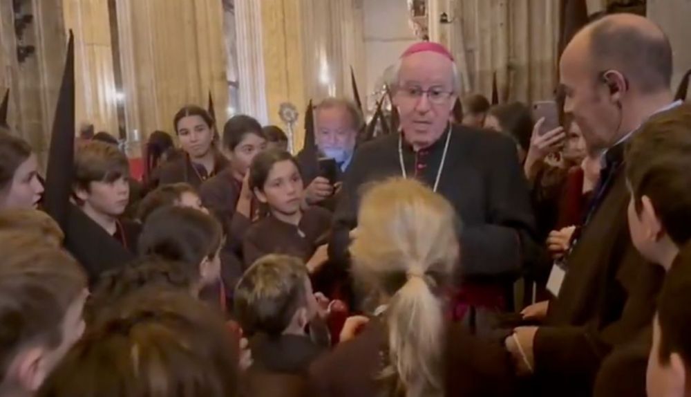 El arzobispo de Sevilla, José Ángel Saiz Meneses, trató de consolar a los pequeños monaguillos de la hermandad con unas palabras de ánimo. "Sería más bonito haber hecho una estación seguida y sin lluvia, pero estas incidencias nos dejan desanimados y nos vencen, ¿sí o no?", preguntaba a los jóvenes del Buen Fin.