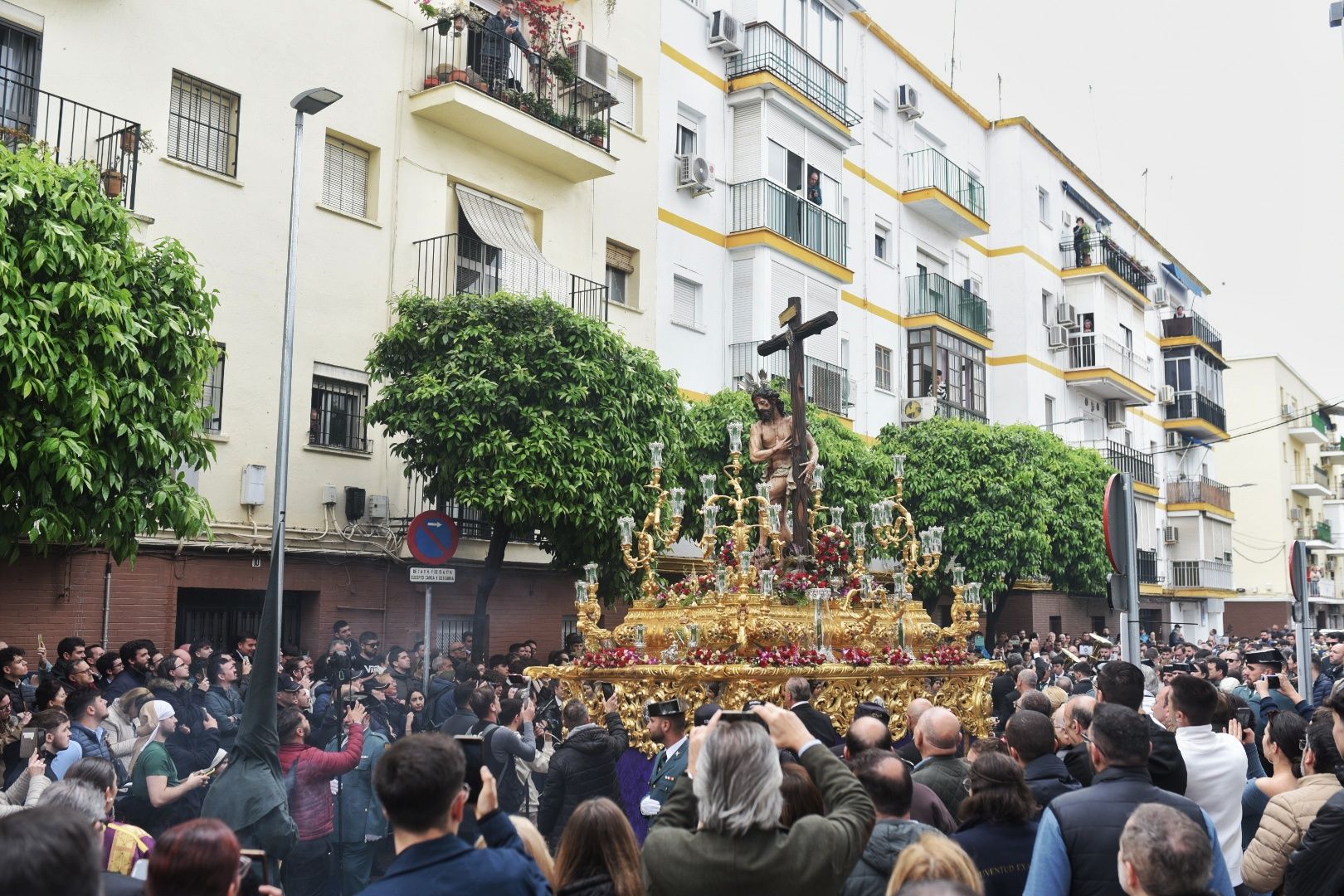 Tras no salir ningún paso ni el Jueves Santo ni en la Madrugada, la Hermandad del Sol ha salido a las calles de Sevilla para intentar poner un poco de luz a esta Semana Santa tan aciaga por culpa del agua.