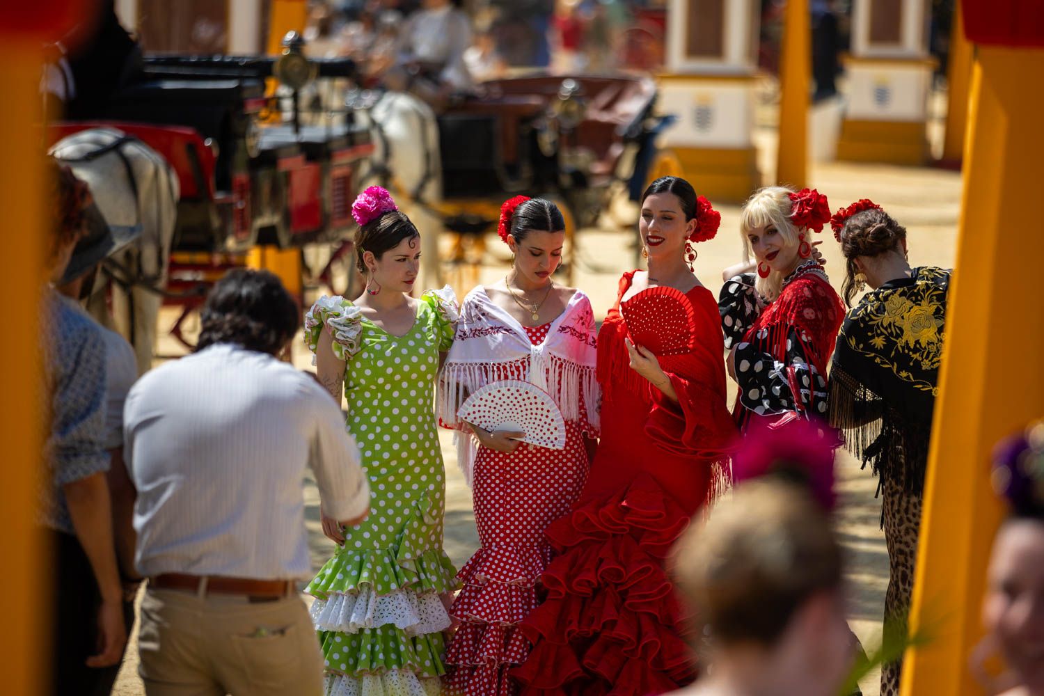 Los carros de caballos, engalanados para la ocasión, recorren las avenidas principales repletos de personas que disfrutan del paseo más tradicional de la jornada. La imagen se repite una y otra vez: grupos de mujeres vestidas de flamenca, con flores en el pelo y abanico en mano, ocupan los carruajes hasta el último asiento. En algunos, menos frecuentes, se ve también a grupos compuestos solo por hombres, todos sonrientes y brindando al paso del gentío.