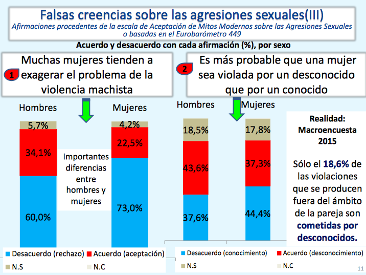 El estudio se sustenta sobre todo en las falsas creencias que existen en España sobre el acoso sexual en el trabajo y las agresiones sexuales. Si bien la mayor parte de la población muestra un claro desacuerdo con afirmaciones relativas a que las mujeres inventan o promueven el acoso sexual (más de un 80%), cuando la afirmación es indirecta y se habla de "exageración por parte de la víctima" y no de invención, el porcentaje de rechazo desciende casi 20 puntos. Del mismo modo, la encuesta refleja que más de 8 de cada 10 personas rechazan afirmar que la culpa de la agresión sexual es de la víctima si "la mujer es poco precavida como para andar sola de noche por callejones oscuros" o que "vista de forma provocativa", lo que muestra que cerca del 15% de entrevistados está de acuerdo en que la víctima es en parte culpable de sufrir una violación.