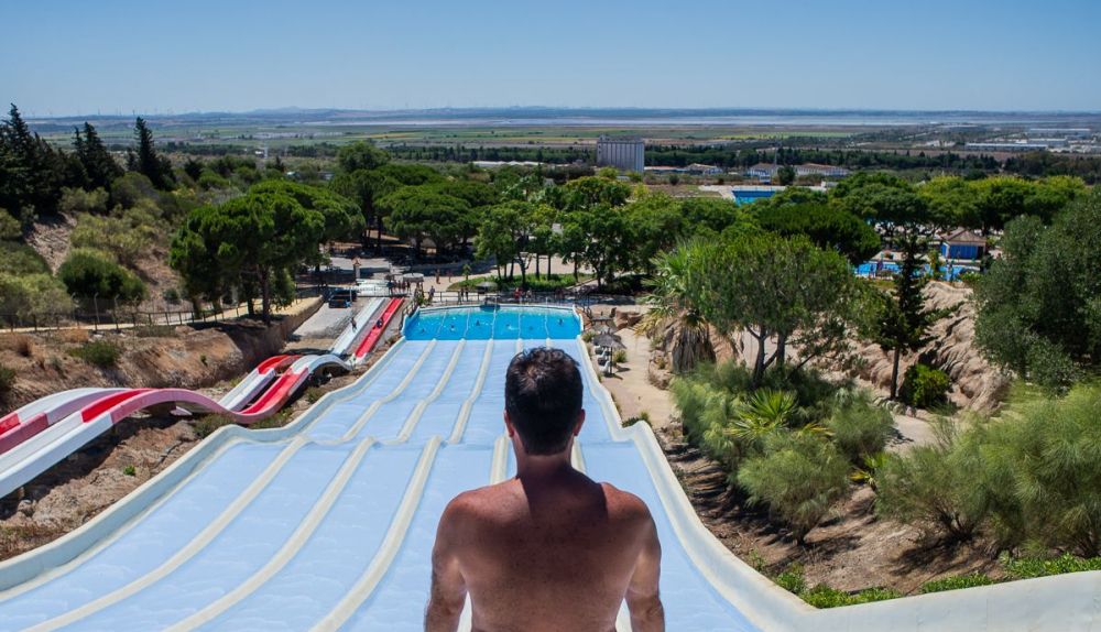 Un chapuzón refrescante, toboganes laberínticos de mil colores y ocho horas de pura diversión. Desde lo más alto de una colina, el toro de Osborne y el Tío Pepe llevan 34 años observando a generaciones de familias pasarlo en grande en un parque acuático que ya se ha convertido en un icono de El Puerto. Aqualand Bahía de Cádiz, que abrió sus puertas en 1987 con el nombre de Aquasherry, no solo se consolida como un espacio de ocio referente en la Bahía sino también es protagonista de uno de los planes más míticos del verano. Quién no guarda entre sus recuerdos una foto con el pato Donato a la entrada del parque.
