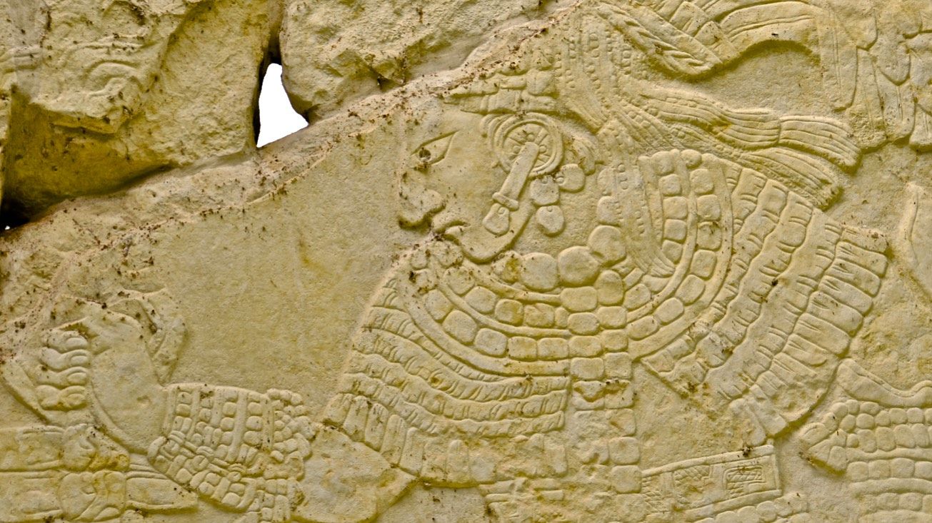 Arriba en las fotos, fragmentos del Muro Este en el Cuarto 1. Los personajes lucen grandes tocados de plumas de Quetzal, adornos con piel Jaguar y serpiente en sus trajes, propios de una danza ritual.