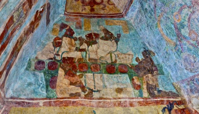 Arriba un fragmento del Muro Norte en el Cuarto 1: la presentación del heredero al trono en frente de la Corte y los dignatarios visitantes, por el gobernante de Bonampak, Chan Muwan II. Hay setenta y siete personajes que cumplen diversas funciones dentro de la narrativa.