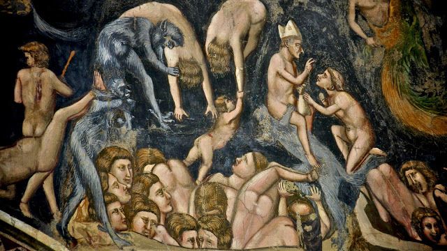 Las bandas inferiores de ambos muros están dedicadas a narrar la Pasión, la lamentación sobre Cristo muerto y la Resurrección de Cristo. En la pared opuesta, a los pies de la iglesia, se representa ¡el Juicio Final! Giotto pintó catorce alegorías de Vicios y Virtudes. Los Vicios están en el muro izquierdo, mientras que las Virtudes se encuentran en el derecho. Por si no te habías enterado... los Vicios conducen al infierno, y las Virtudes llevan a la salvación. Y para asustarlos ¡qué mejor que unos demonios y esa visión horrible del infierno! Vean las fotos de abajo...