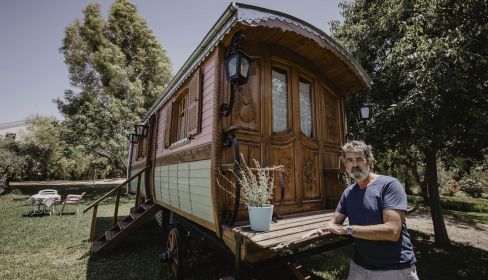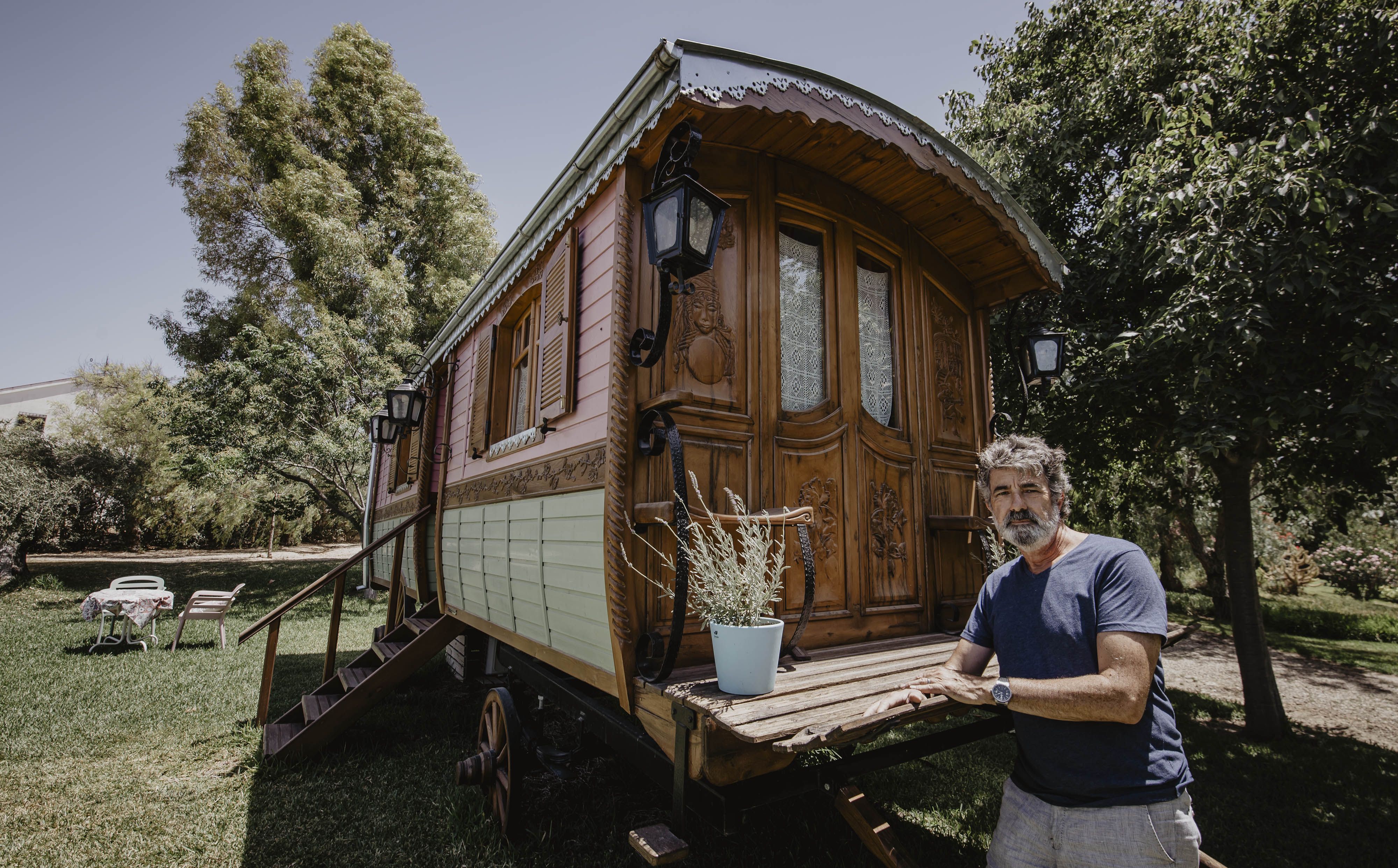 Para llegar al carromato gitano hay que subir una loma y pasar junto al burro Julio, desde la piscina. La roulotte hasta tiene nombre, se llama La niña, y está construida entera de madera por una empresa de Rumanía. “Tardó cinco días en llegar en tráiler”, abunda el propietario del negocio. Desde la terraza del carromato, al despertarse, quien se aloje en él puede contemplar la Peña de Arcos nada más levantarse. “Es un lujo”, dice Montilla.