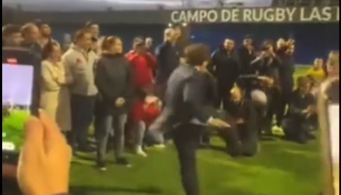 El dirigente del PP estuvo a punto de dejar sin rostro a un fotógrafo tras darle una patada a un balón ovalado de rugby. Almeida no es la primera vez que protagoniza un incidente parecido, ya que hace dos años golpeó en la cara de un niño que se encontraba cerca de una portería.