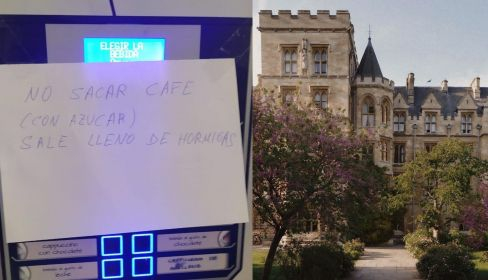 En las imágenes se puede ver una cafetera en la que han colocado en un cartel la advertencia de no pulsar la opción “café con azúcar” porque “sale con hormigas”. Además, añade otra imagen de un aula sin techo, con el cableado caído.