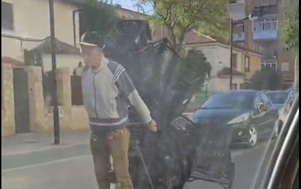 Sin embargo, lo que es peculiar es que va transportando más de 20 cajas que sirven para transportar frutas y verduras. Aunque peligroso, es de admirar la fuerza y maestría del anciano, que es capaz de mantener el equilibrio sin moverse.